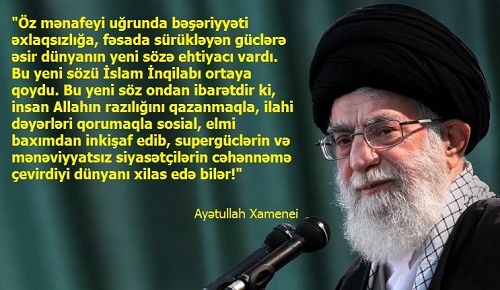 Ayətullah Xamenei əlavə edib ki, İslam İnqilabı bəşəriyyətə yeni təklif, yeni söz oldu. “Öz mənafeyi yolunda bəşəriyyəti əxlaqsızlığa, fəsada sürükləyən güclərə əsir dünyanın yeni sözə ehtiyacı vardı. Bu yeni sözü İslam İnqilabı ortaya qoydu. Bu yeni söz ondan ibarətdir ki, insan Allahın razılığını qazanmaqla, ilahi dəyərləri qorumaqla sosial, elmi baxımdan inkişaf edib, supergüclərin və mənəviyyatsız siyasətçilərin cəhənnəmə çevirdiyi dünyanı xilas edə bilər!.”