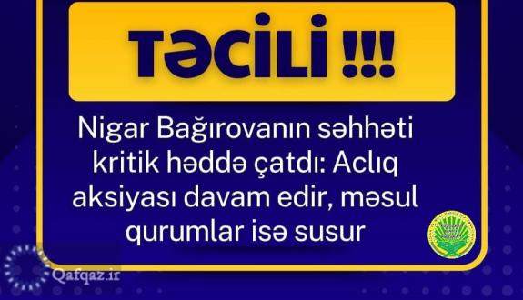 Qafqazagency.ir xəbər verir ki, Əldə etdiyimiz məlumata görə, artıq uzun müddətdir aclıq aksiyasını davam etdirən Nigar Bağırovanın səhhəti son günlərdə kəskin şəkildə pisləşib. Məlumata əsasən, o, huşunu itirərək yerə yıxılıb və başı yerə çırpıldığı üçün ciddi şəkildə zədələnib.