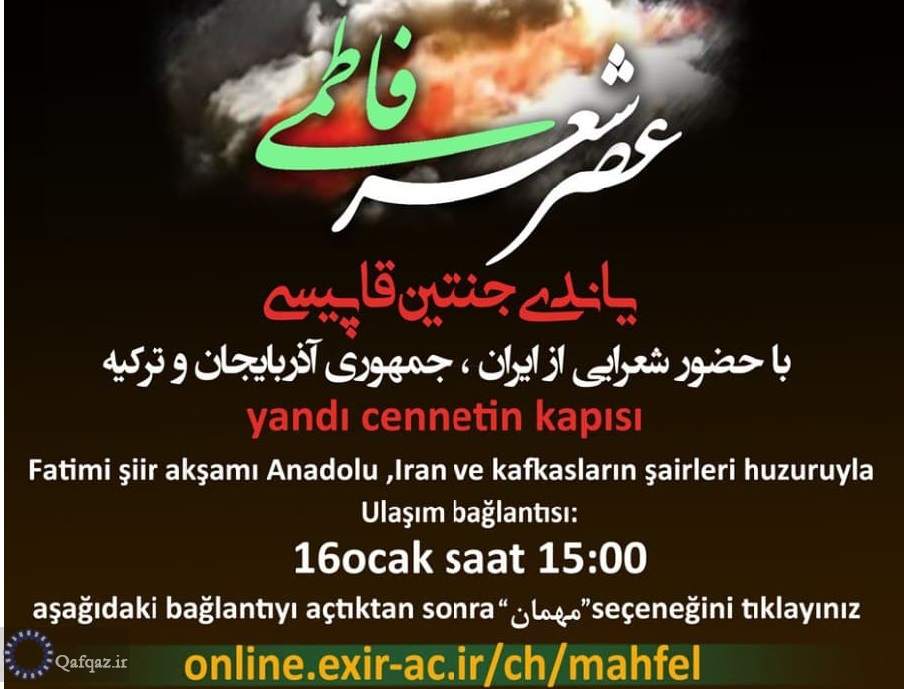 به گزارش پایگاه خبری حقایق قفقاز، شنبه 27 دی ماه 1399 وبیناری با عنوان «عصر شعر فاطمی» با حضور شعرایی از جمهوری اسلامی ایران، جمهوری آذربایجان و ترکیه راس ساعت 15 بعدازظهر به همت مجموعه های فرهنگی استان در اردبیل برگزار خواهد شد.