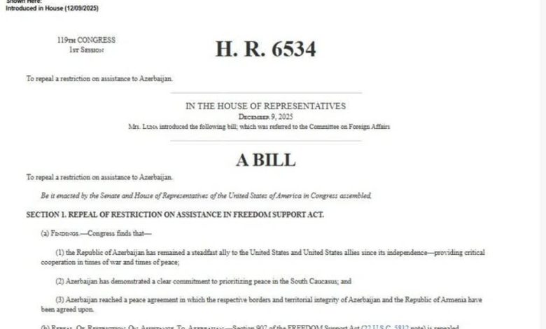 کنگرهٔ آمریکا لایحهای را منتشر کرده است که لغو محدودیتهای مربوط به کمک به جمهوری آذربایجان را پیشبینی میکند